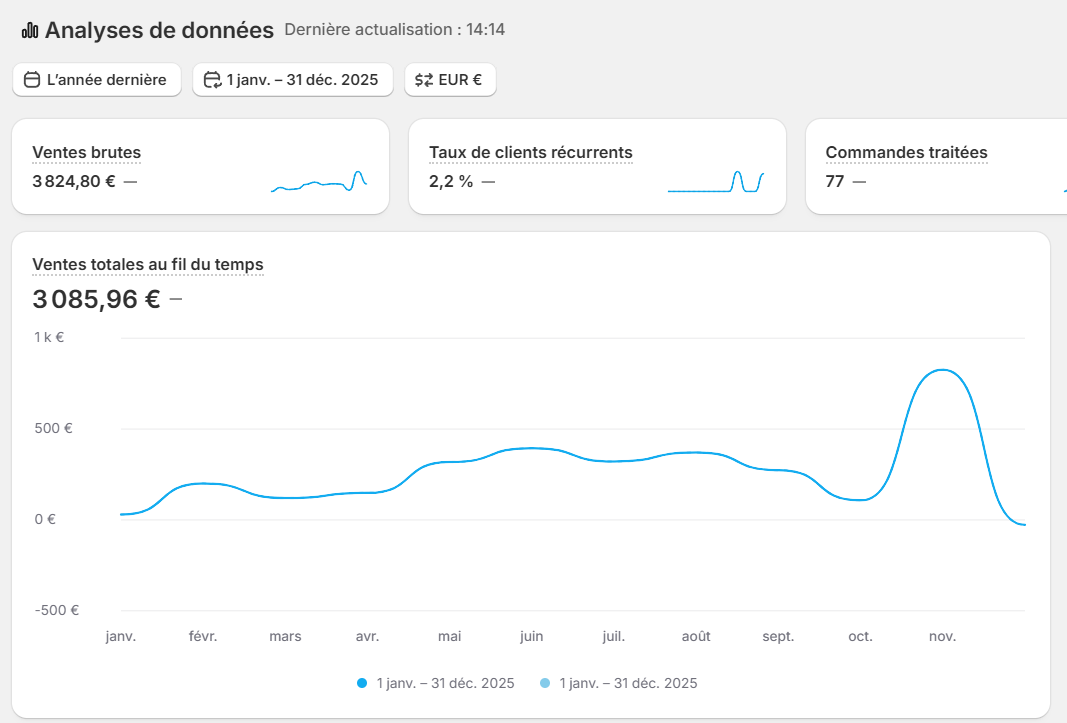 Axes de développement possibles : lancement de campagnes Google Ads, élargissement du catalogue produits, mise en place de relances paniers abandonnés, création d’une newsletter, et activation des réseaux sociaux pour booster visibilité et conversions.